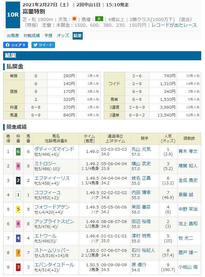 この予想方法で、午後も恐らく不的中だと確信していましたが検証中ですので続行して馬券を購入して検証した結果がコチラです。