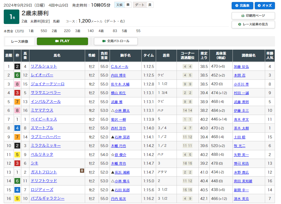 9月28日・中京5レース 2歳新馬 芝2000m