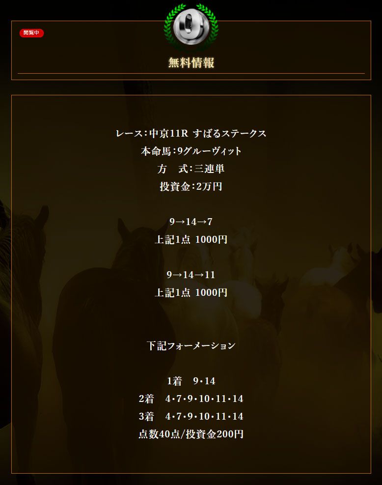 3日間開催最終日のすばるS予想は点数40点に対して馬券に絡んだ競走馬は“0頭”前日同様に人気馬を頭に流したフォーメーション、基本的に1~5番人気をフォーメーションで組むだけとあまり参考にならないサイト、そして不的中なら使う余地がないと断言できる質の情報と言えます。
