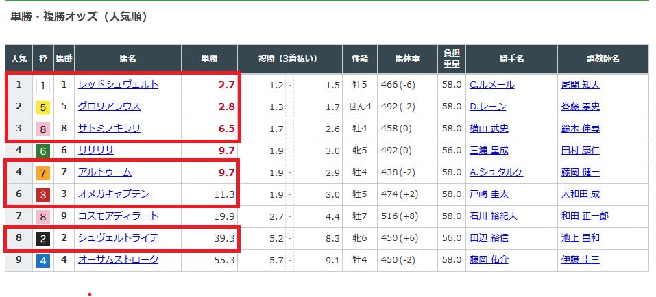 軸は土曜日と変わらず2番人気の馬を選んでいます。