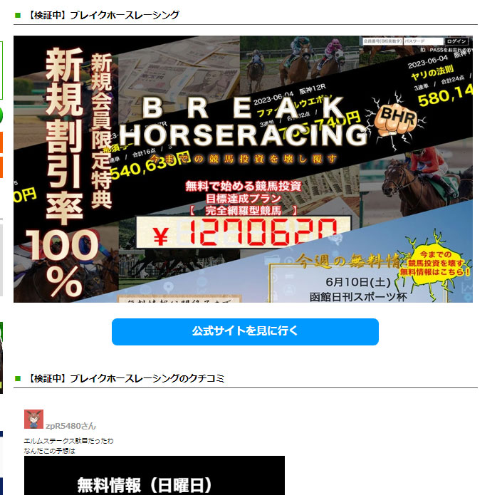 【ブレイクホースレーシング】ですが、「今までの競馬投資を覆す」そうで情報会社はどこも一緒で競馬投資業界に貼りついた悪いイメージをぶち壊すそうです。