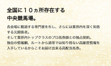 絶対的情報屋と業界内トップクラスのプロ馬券師と独占契約をしているそうで高配当馬券を提供するそうです。