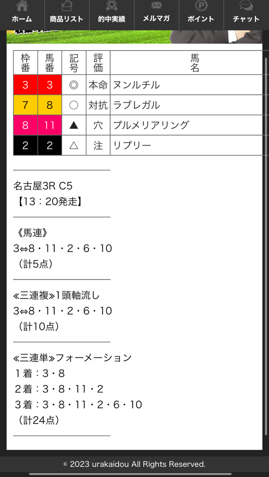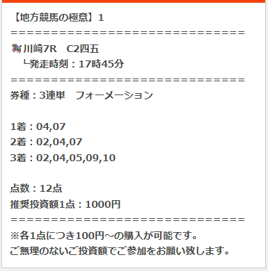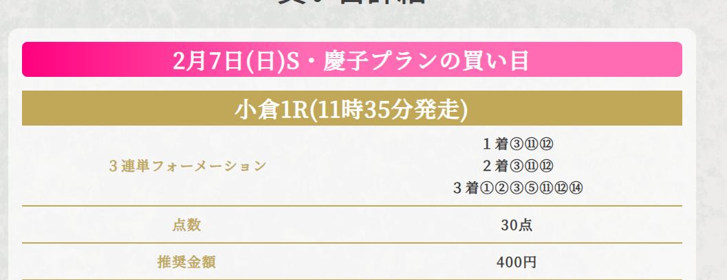 買い目を見た時は少し驚きましたが、見事な的中でしたね! 流石の分析力です。 結果に大満足です。ありがとうございました。