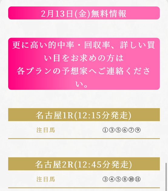 無料情報、こちらを紹介され始めてやってみました。 無料予想なのに精度の高い予想で当たりました。 これからも参考にさせていただきます。 サポートセンターに聞いたら平日は地方競馬の無料情報も出すという事なので期待です。