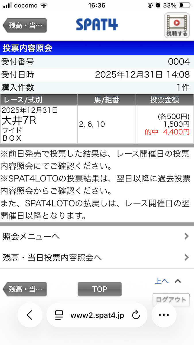 終わりよければ全て良し、1年の負けを有馬で取り返した! 65万8550円の払戻しサンキューです、年明け一発目の東西金杯頼みましたよ。
