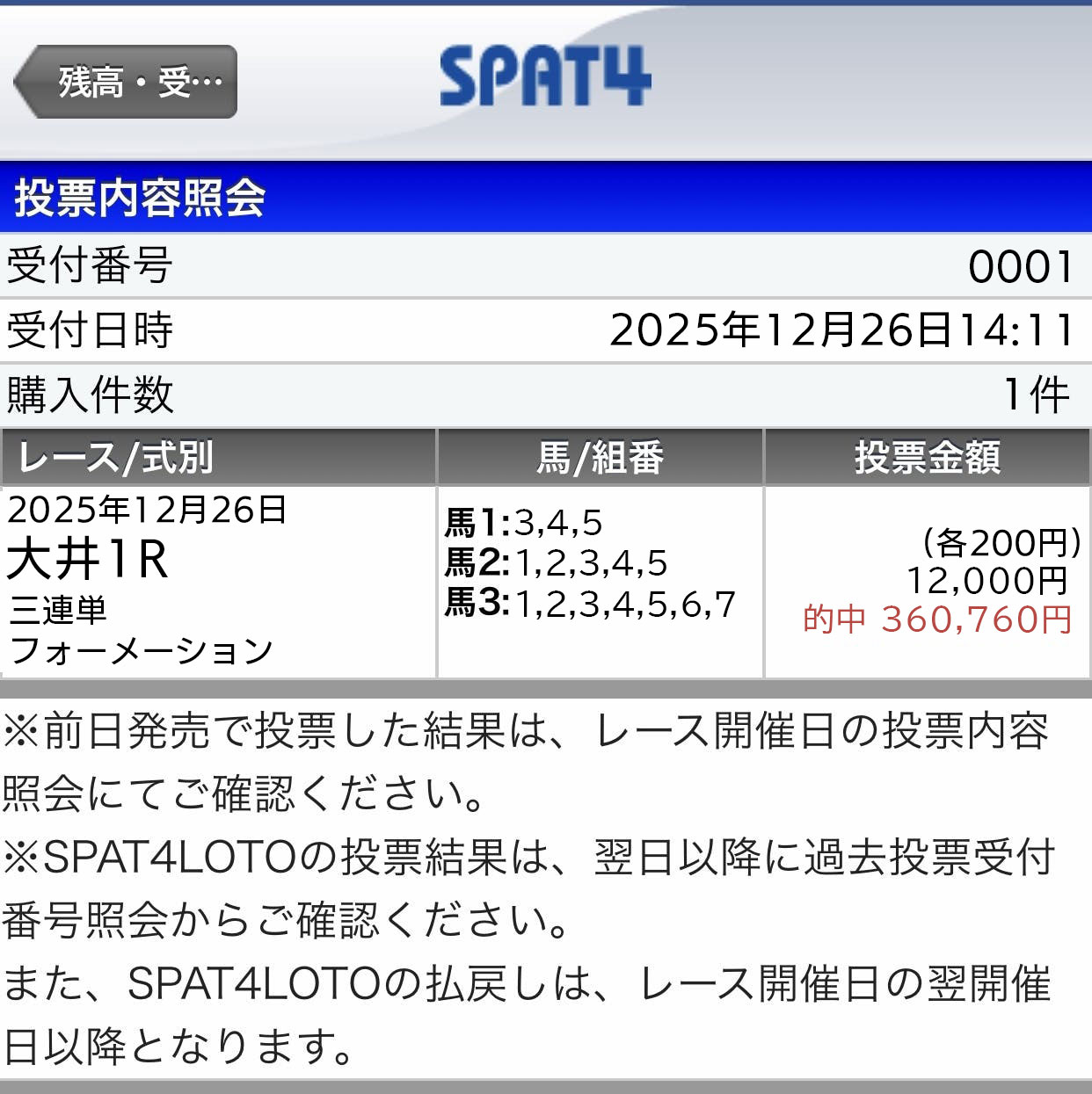 まさかの有馬記念前のレースで3連複41倍的中! 推奨通りに買って12万3千円もの配当ありがとうございました。 無事に有馬は自分の予想ではずしましたが、この的中があったおかげで2025年優秀の美を飾れました!