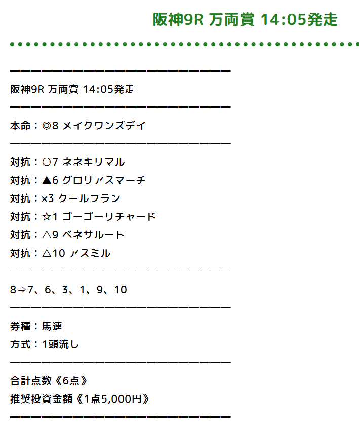 12月24日から28日までの無料予想がこれでした 買い目は3種類(馬単マルチ、ワイド軸1頭流し、3連複1頭流し)で、買い目は全て同じです 24日 名古屋1R 11→4.6.7.8.10 この買い目で馬単マルチ2200円 ワイド流し830円 3連複流し2190円 25日 園田7R 10→1.3.4.8.9 馬単マルチ 400円(トリガミ) ワイド流し 190円 3連複流し 不的中 26日 笠松5R 6→3.5.7.8 馬単マルチ 3810円 ワイド流し 1160円 3連複流し 不的中 27日 中山1R 10→1.7.9.13.14 馬単マルチ 1620円 ワイド流し 770円 3連複流し 1750円 28日 中山1R 11→4.6.7.14.15 馬単マルチ 不的中 ワイド流し 不的中 3連複流し 不的中 これには「ある傾向」があります 軸馬には必ずオッズ1位の馬を選出してます 人気馬ばかり選んでるから、この3日以外ではおそらく払い戻しが少ない日も多いのではないかと思います ドンピシャじゃあるまいし、人気馬ばかりを軸にしてもトータルでの回収率は少ないですよ オッズ1位の馬が飛んだら不的中になります 人気馬だから必ず入ると思ってる時点で素人ですね 地方競馬はわずか3日しか見ていないので何とも言えませんが(3戦3勝とはいえ、まぐれの可能性もあるので。たまたま3レースとも軸馬が1着になる可能性が高いレースを選んだのか、だとしたら相当なものですが、これで軸馬が飛んだらどうなるのか、考えているのかどうかも怪しいです) 中央競馬でこれかと まして28日の中山1Rは晴で良でした 夏競馬じゃあるまいし、それほど荒れる要素はなかったはず(ちなみに11の馬は13着でした) よってBADに限りなく近い、どちらでもない、というのが自分の感想です