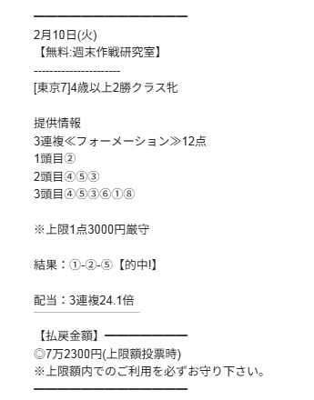 ≪無料情報≫初めての利用の検証結果です。 東京7レース、推奨買い目通り、推奨投資金額で馬券購入。 ≪結果≫1-2-5的中 ≪払戻≫7万2300円 ≪回収率≫241% 使ってみた感想。 予想家たるもの、的中率100%以上は鉄則で、200%越えは有料情報でもなかなかそう巡り合えない予想だと感じました。 予想が上手いですね、的中重視で配当を+α乗っける感じというか、また次回も積極的に利用した競馬無料予想です。