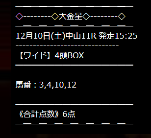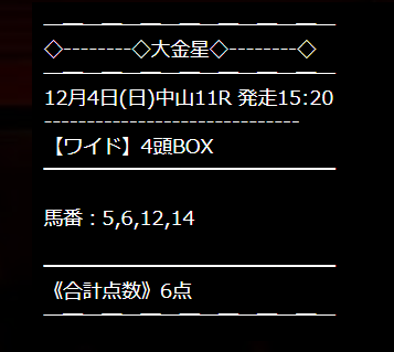 サイト名大黒星にでもしてください。 ワイドまったく見当違いな買い目でした。 当たらないですね。