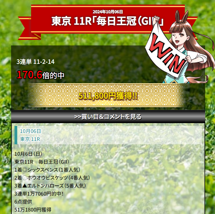 6点(1点3千円)1万8千円の馬券代が毎日王冠で一撃51万1800的中獲得! 他でもこのサイト優良だから使ってますが相性良いですね!
